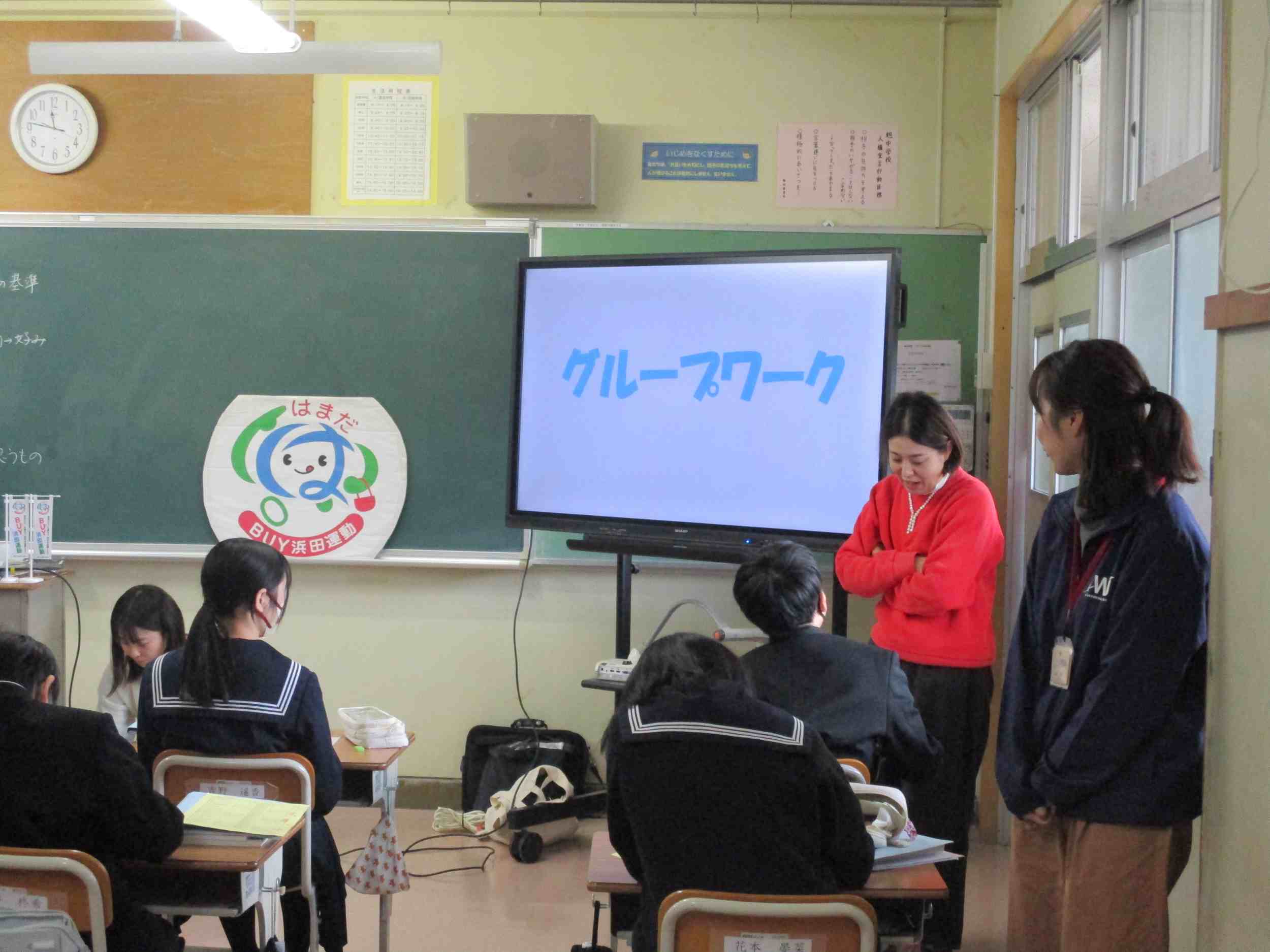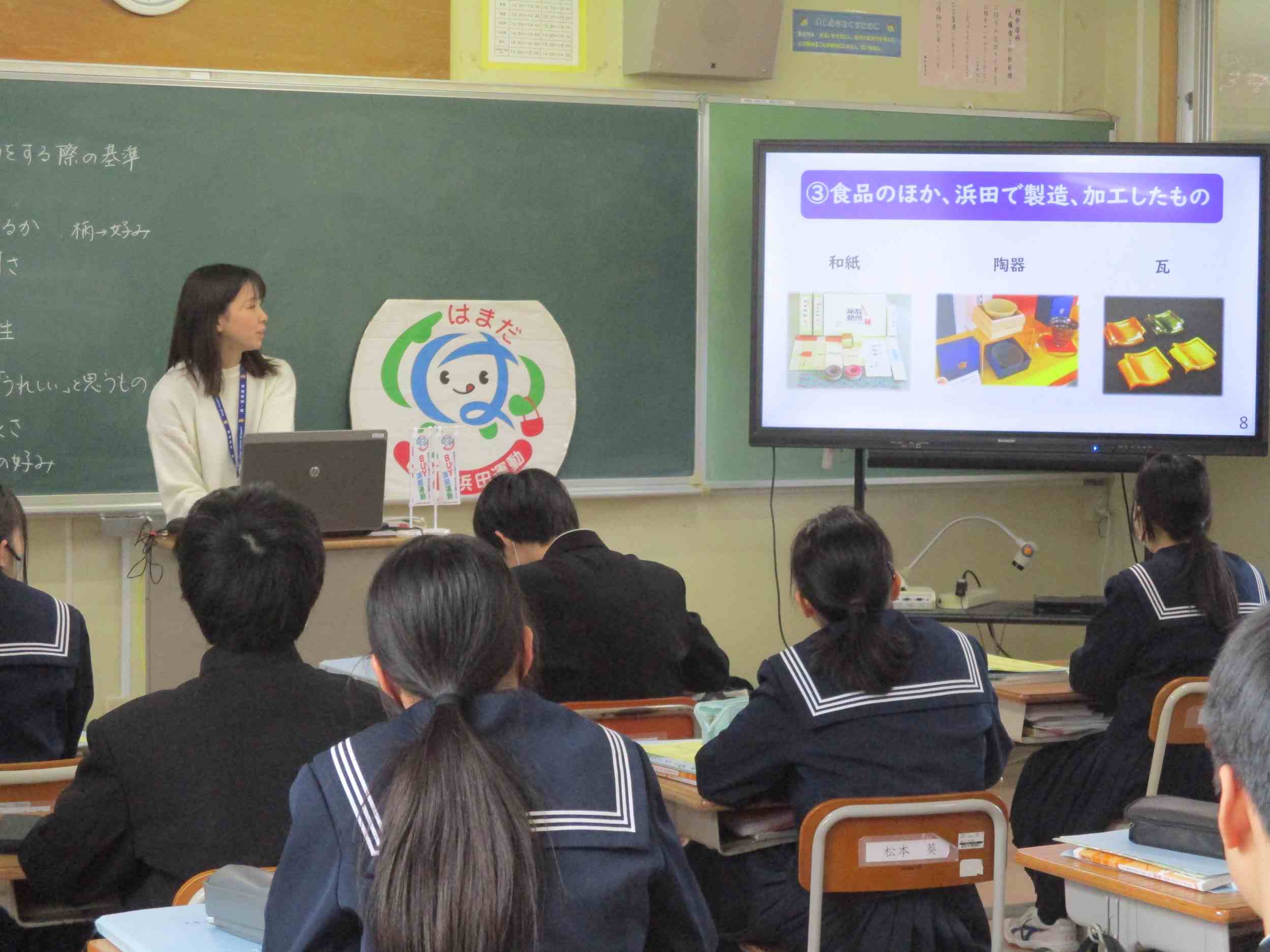 1月29日(木)浜田市商工労働課より2名来校され、1年生の家庭科授業でBUY浜田運動についてわかりやすく丁寧に教えていただきました。ワークシートに各自が①買い物をする際に、商品を選ぶ基準は何ですか?②「浜田のモノ」を買うことの良さは何ですか?を記入しグループワークで話し合いながら学びを深めました。