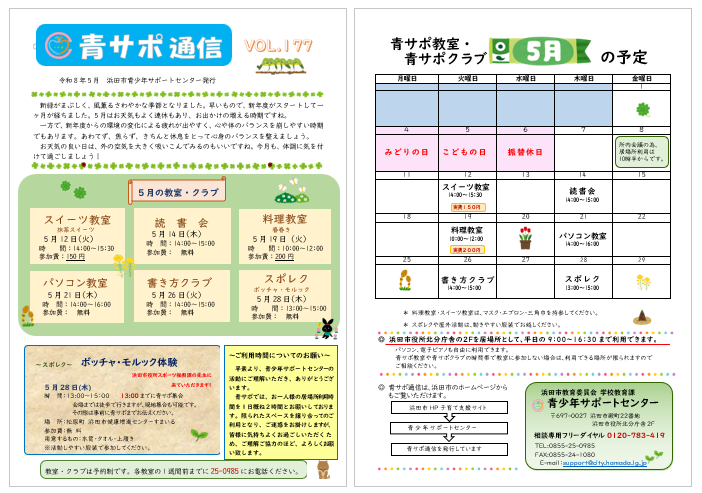 青少年サポートセンターでは、“青サポ通信”と題し、活動内容などを情報提供しています。 青サポ教室の予定表も一緒に掲載しています。 ぜひ一度ごらんください。