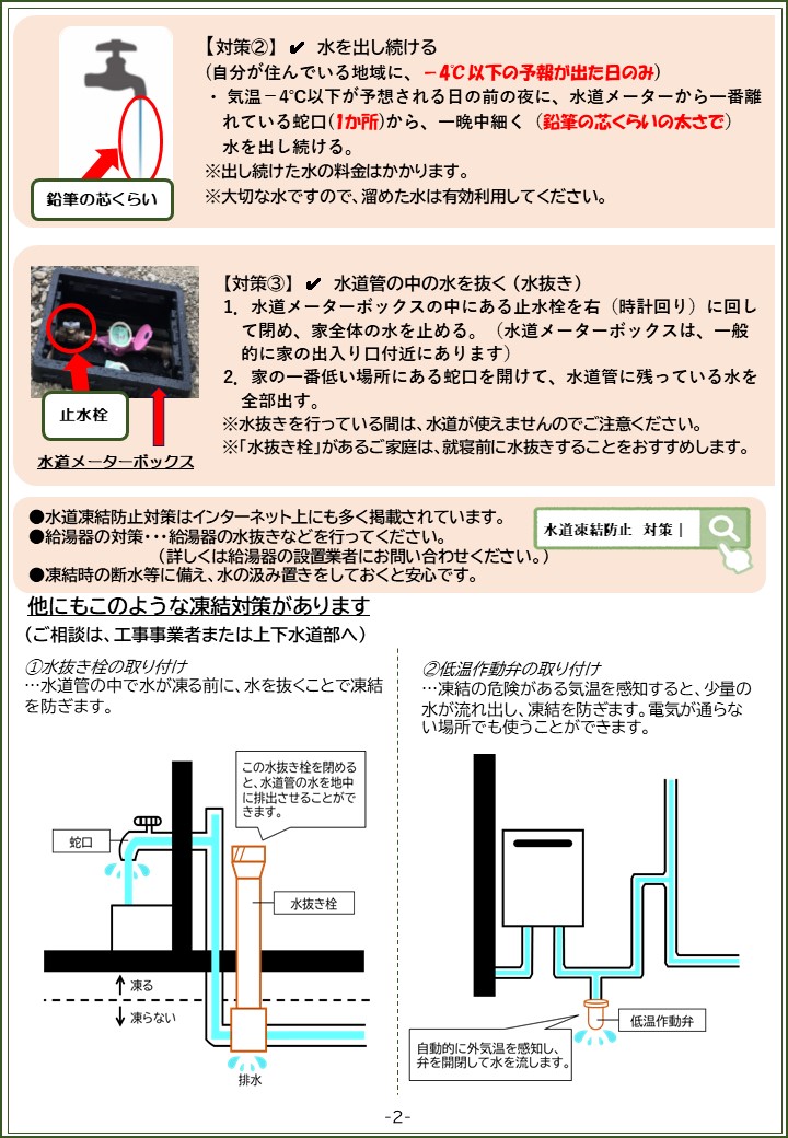 ○特に翌朝の冷え込みが予測されるような時には、水道メーターから一番離れている蛇口を少し開けておくことなども凍結を防ぐ有効な方法です。