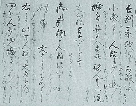 殊(こと)に勇ましく大はたらきのよし 右にて此方(このほう)人数も大いに力を得(え)候よし乍(ながら) 何分人数少なきゆへ城守(しろまもり)もむづかしく 付(つ)いては私事もかくごいたし居(お)りし候か 何分々々熊若丸ふびんにぞんじ 一(ひと)まづ立(たち)のかせ度(た)く存じ表初(おもてはじめ)役人衆へも 申し出内々(ないない)しのびにて立のき候様(よう) いたしその・・・」