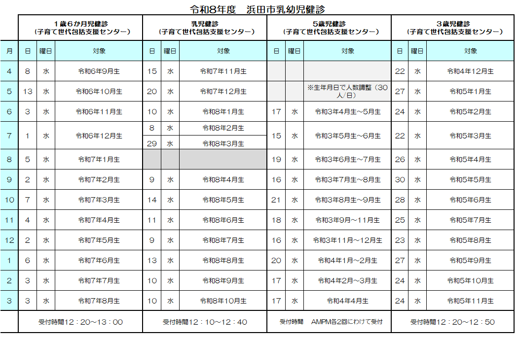 令和8年度乳幼児健康診査のお知らせです。日程については以下のとおりです。