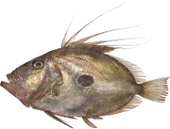 島根県では「バトウ」と呼ばれるマトウダイは、漢字で書くと「的鯛」、「馬頭鯛」となり、体の真ん中に弓の的のような黒班があること、顔が馬の頭に似ていることが名前の由来になっています。 バトウのエサの食べ方は特徴的で、口を大きく開けて前方に長く伸ばし、海中のエサを吸い込むようにして食べます。 刺身、煮付け、フライなど、いろいろな料理に使える便利な魚です。 |