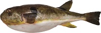 マフグの体表はとげがなくなめらかで、尾びれは黄色っぽいです。だしがよく出るので、鍋料理にして食されます。島根県にはフグを使った数多くの加工品が生産されています。その一つに「フグ味醂干し」があり、 浜田の名産品となっています。 |