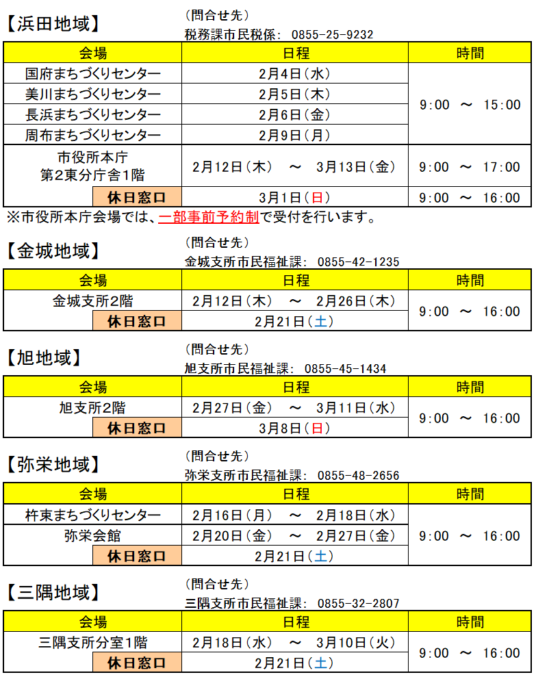 所得税(令和7年分)の確定申告及び市民税県民税(令和8年度)申告の受付が始まります。浜田市が開設する相談会場を利用される方は、以下の案内をご確認ください。