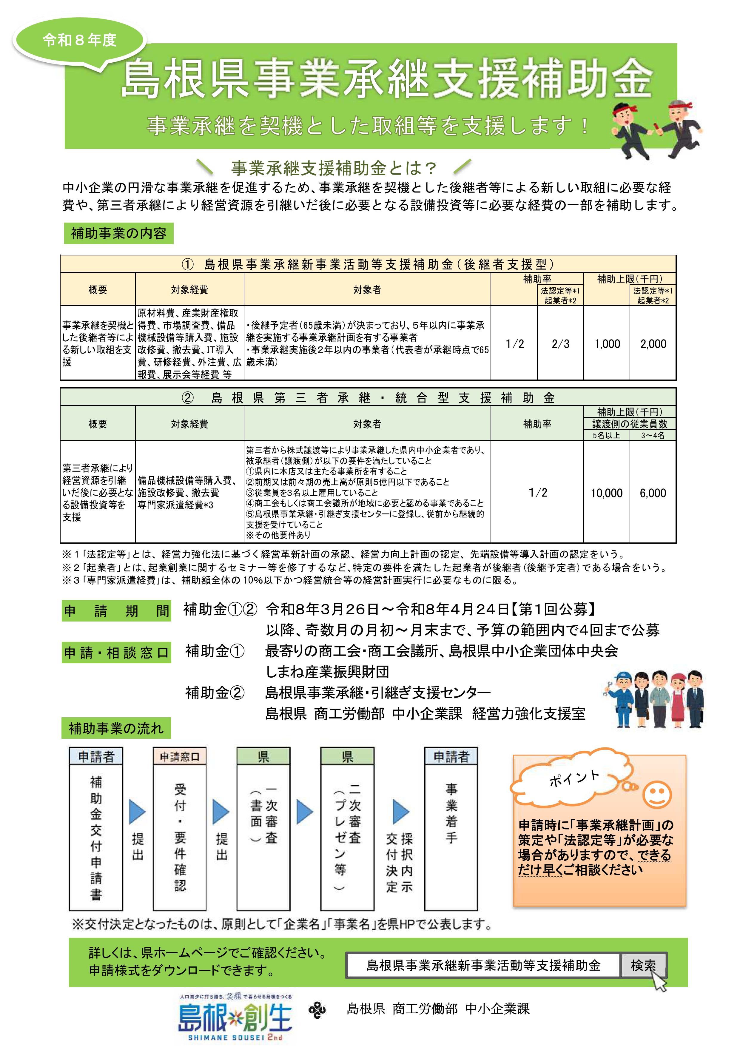 「島根県第三者承継・統合型支援補助金」は、県内中小企業者が第三者承継により経営資源を引継いだ後に必要となる設備投資に係る経費の一部を補助することにより、後継者不在による廃業を未然に防止し、地域に必要な事業の継続、雇用の維持を図ることを目的としています。