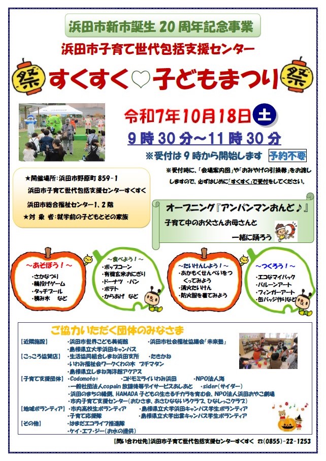 すくすく♡子どもまつりを 令和7年10月18日(土)9:30~11:30 に開催します。