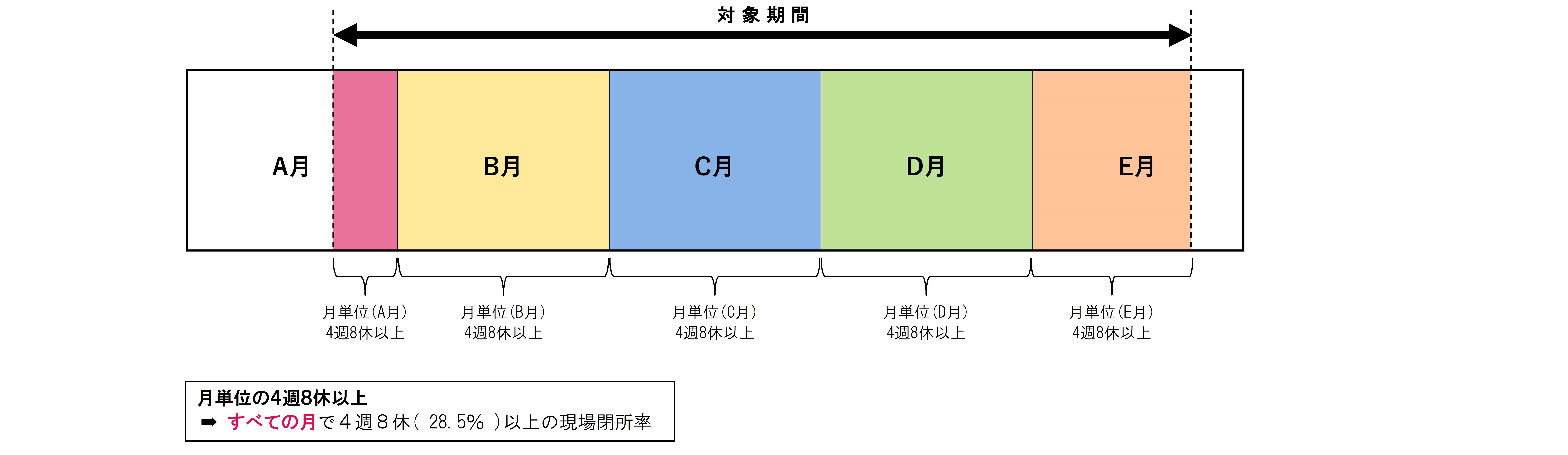 ➡ 対象期間において、すべての月で4週8休以上の現場閉所を行うこと。