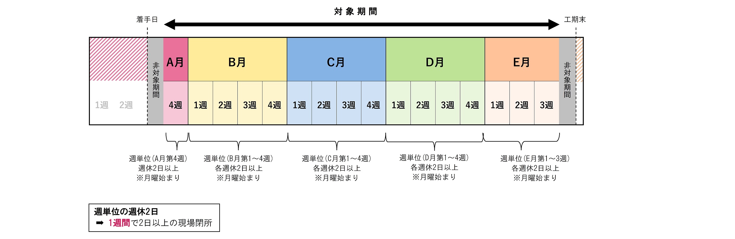 ➡ 対象期間のすべての週で、土曜日・日曜日の両日に現場閉所を行うこと。