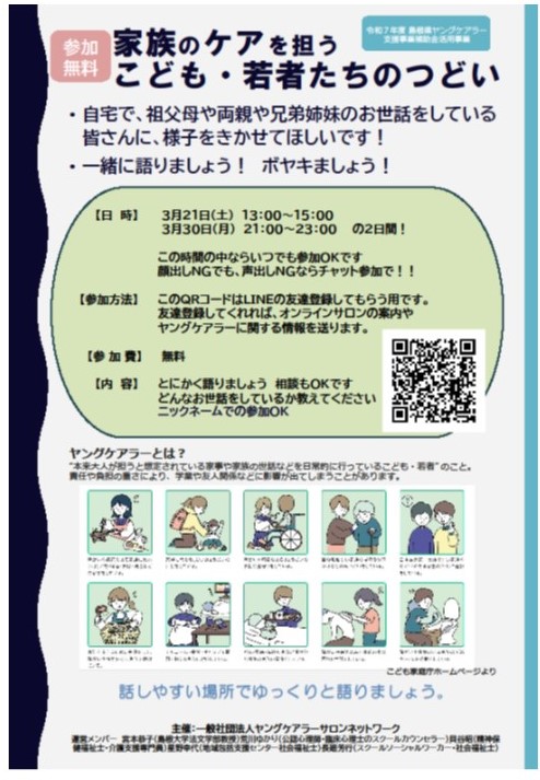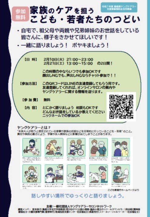 このオンラインサロンは、「自分はヤングケアラーかな?」と思う子ども・若者が相談や交流、情報提供のためにつながる、オンライン上の居場所です。