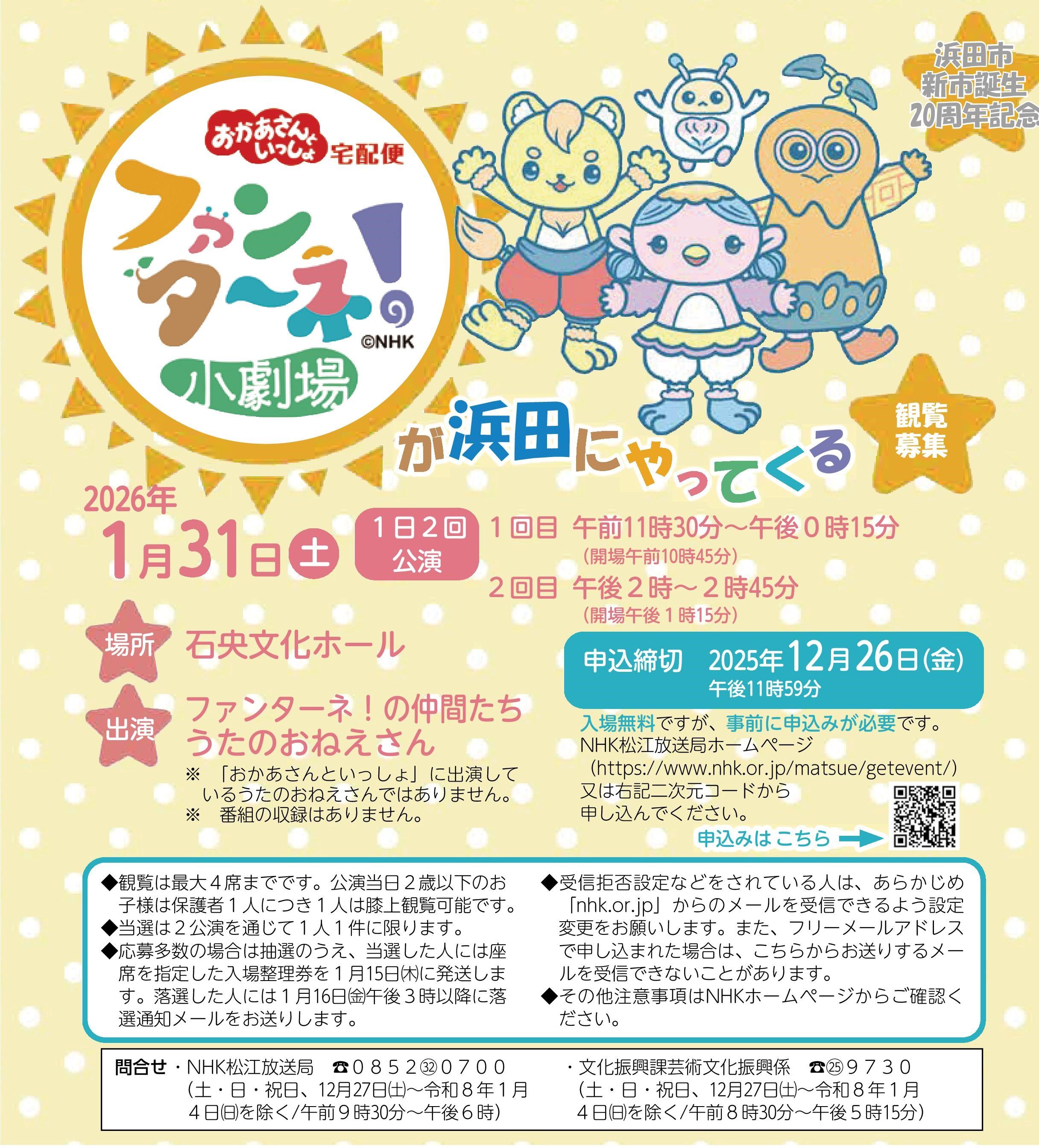 NHK松江放送局ホームページ https://www.nhk.or.jp/matsue/getevent/ から申し込んでください