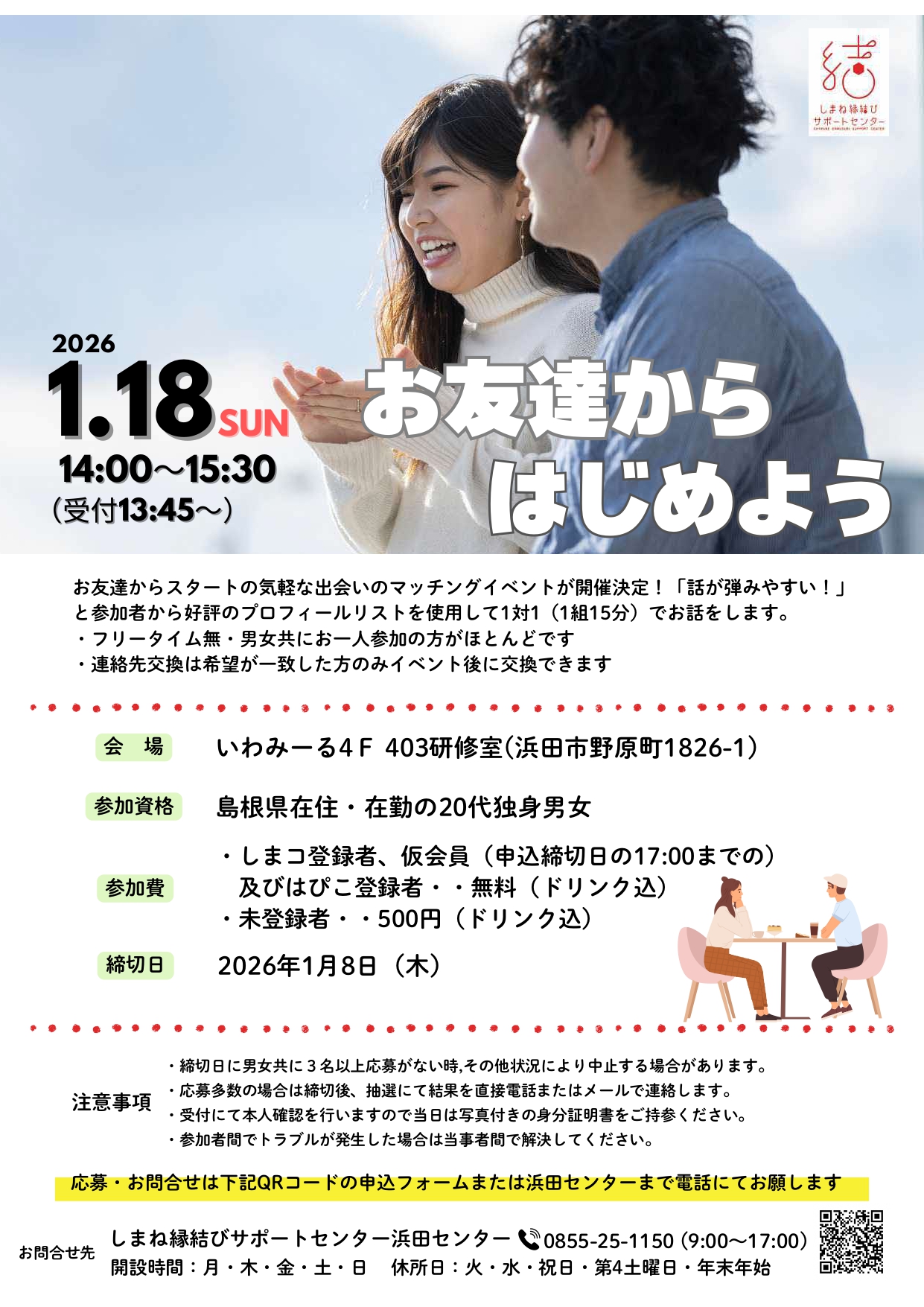 申込フォームによる申込み又はしまね縁結びサポートセンター浜田センターへお電話でお申込みください。