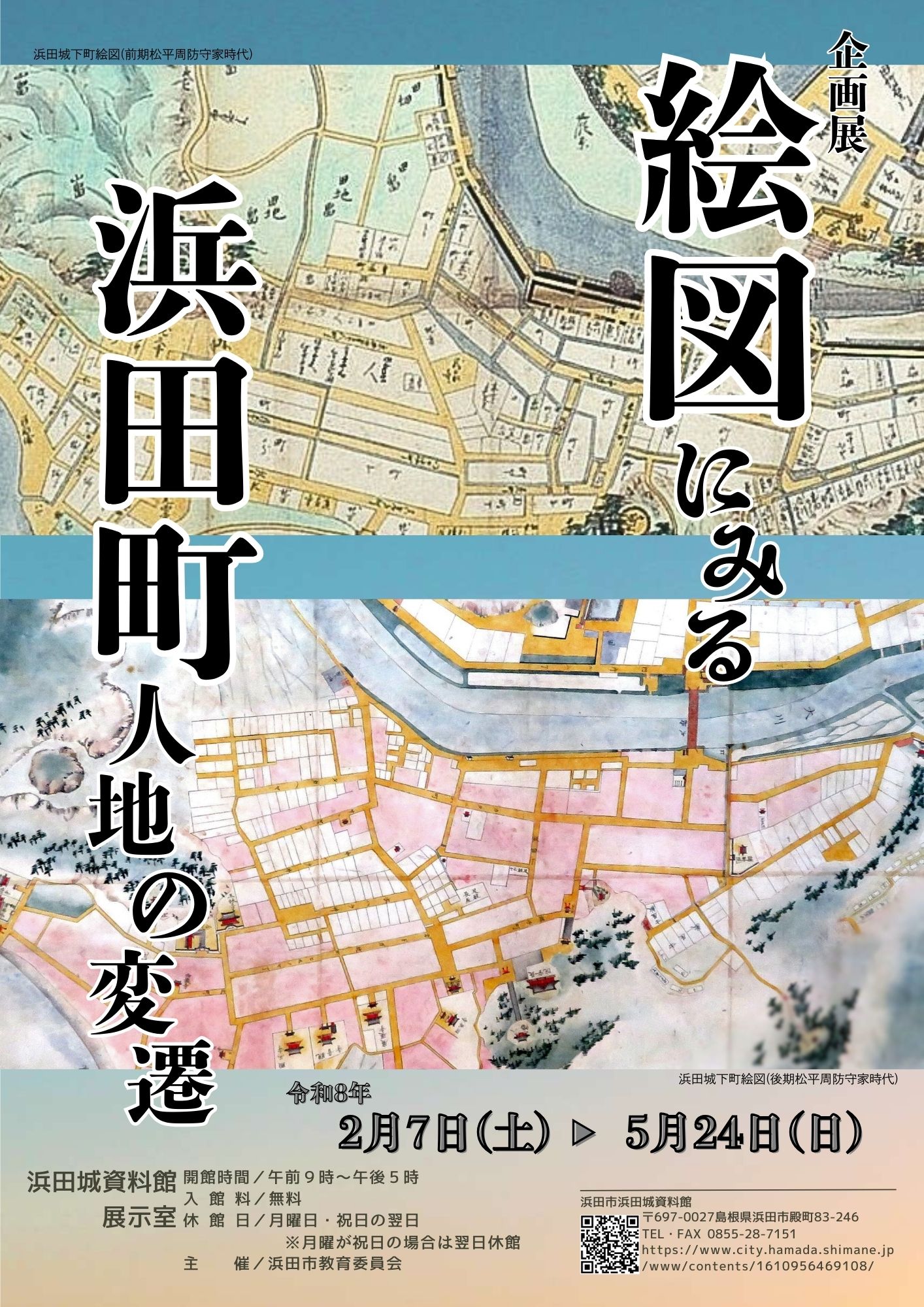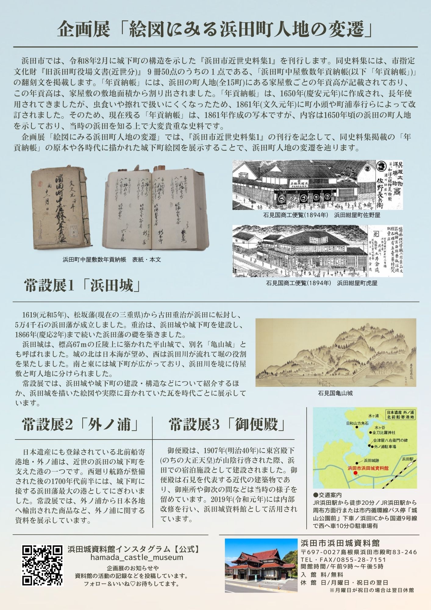 浜田市では、令和8年2月に城下町の構造を示した『浜田市近世史料集1』を刊行します。同史料集には、市指定文化財『旧浜田町役場文書(近世分)』9冊50点のうちの1点である、「浜田町中屋敷数年貢納帳(以下「年貢納帳」)」の翻刻文を掲載します。本企画展では、『浜田市近世史料集1』の刊行を記念して、同史料集掲載の「年貢納帳」の原本や各時代に描かれた城下町絵図を展示することで、浜田町人地の変遷を辿ります。