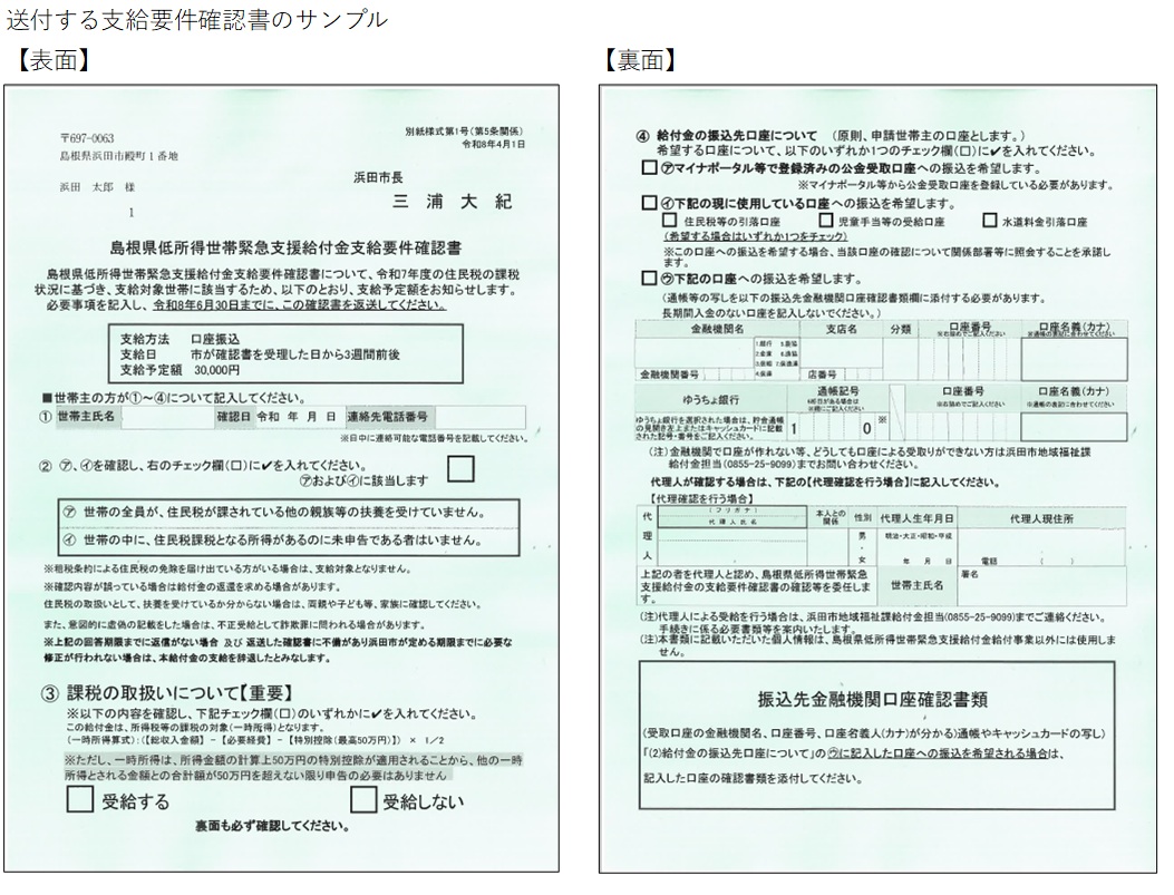 支給対象世帯主宛に「島根県低所得世帯緊急支援給付金支給要件確認書」が届きます。