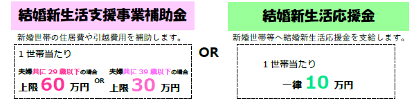 ※結婚新生活支援事業補助金、結婚新生活応援金のいずれも予算に限りがありますので、年度途中で受付を終了する場合があります。お早めにご相談ください。