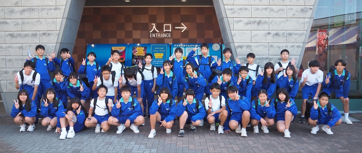 10月11日(金)に島根海洋館アクアスに行ってきました。これは総合的な学習の時間に行っている浜田の魅力や課題を知る活動の一環として実施しました。アクアスではクイズを解きながら館内を巡り、その後答え合わせとレクチャーを受けました。シロイルカプールのバックヤードツアーを体験し、日頃は聞けないイルカの大きな声に驚いていました。