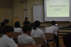 防災士の方から災害時の食事について、ローリングストックや避難所での炊き出し等について、もしものときの食事のポイントについてお話を聞きました。江津の宿泊研修の際には、実際に炊き出しを想定した防災食づくりに取り組む予定で、その事前学習も兼ねて行いました。