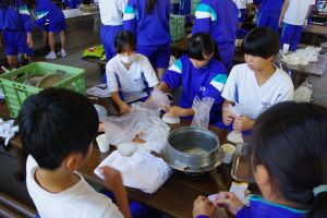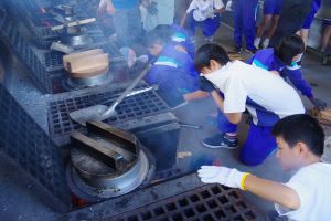 少年自然の家での宿泊研修のプログラムの一つ、野外炊飯活動に合わせて、防災士のかたからの指導を受けながら、避難所での防災食づくりを想定した調理活動を実施しました。