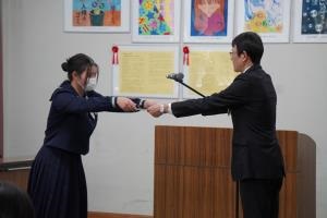 令和7年度浜田市人権作品コンクールの表彰式が行われ、ポスターの部で優秀賞を受賞した濱本さんが岡田教育長より表彰をうけました。