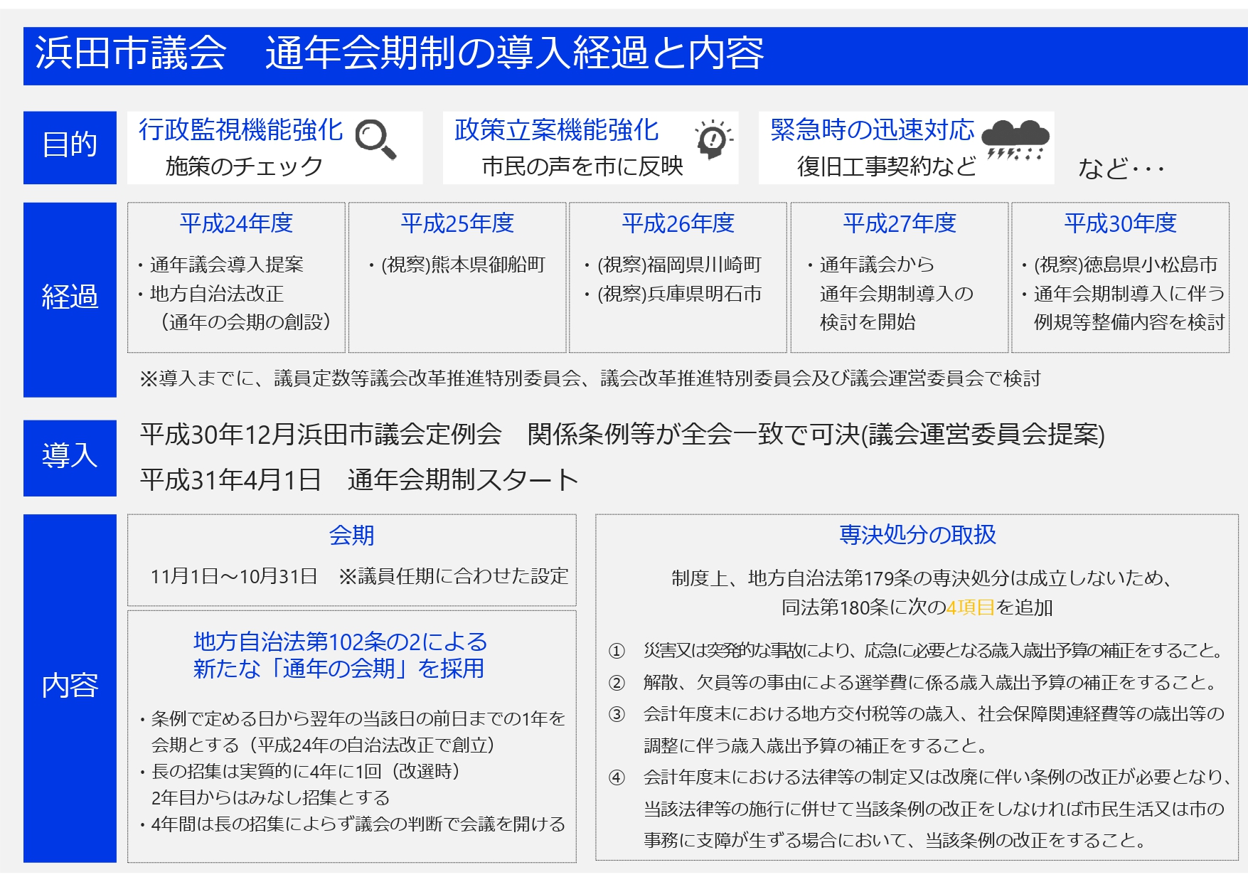 浜田市議会では、平成31年4月1日から「通年会期制(根拠法:地方自治法第102条の2第1項)」を導入しました。