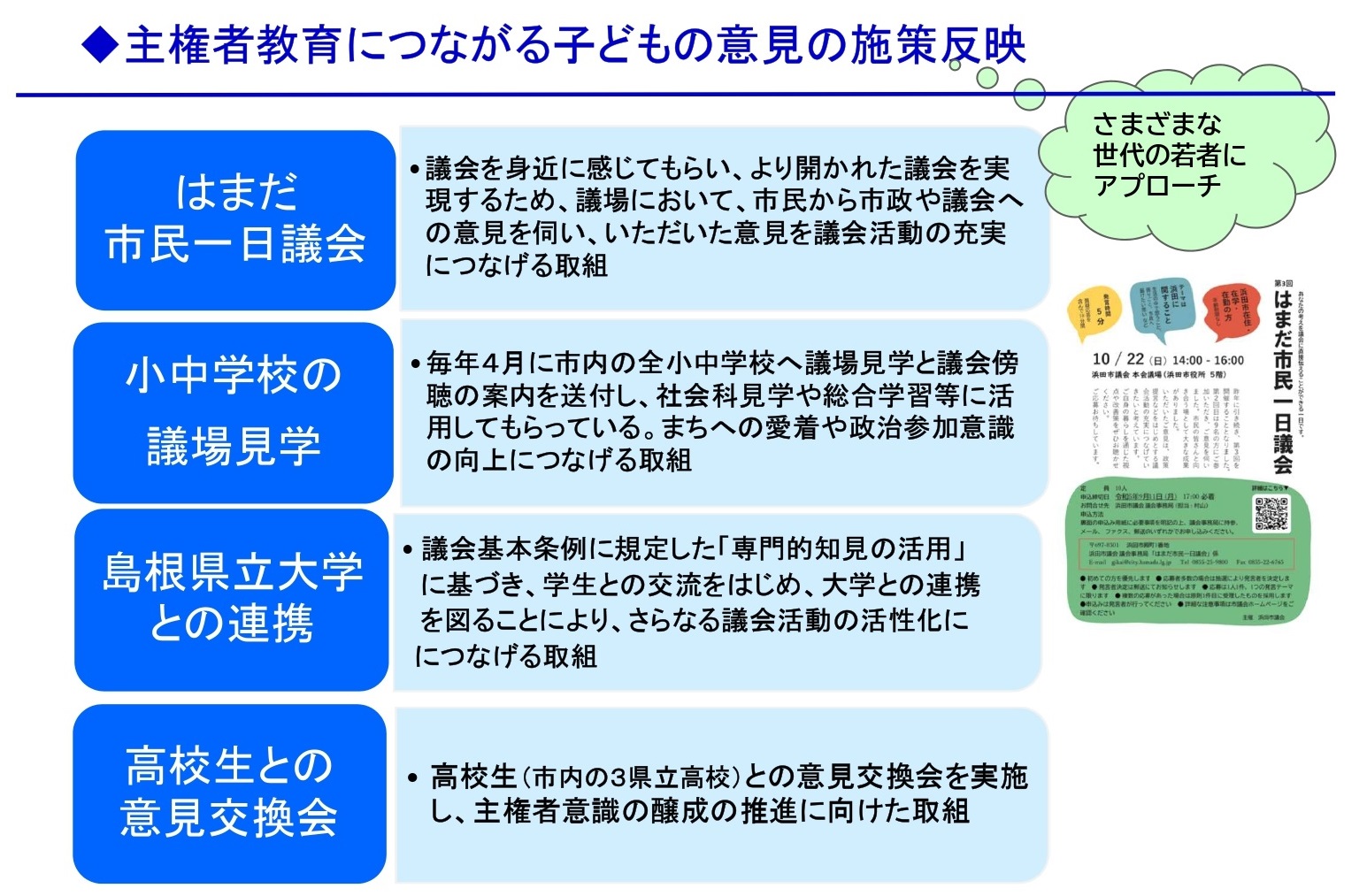 浜田市議会においては、未来の浜田市を担う子どもや若者をはじめ、多くの市民に市政や議会に関心を持ってもらい、その意見をまちづくりに活かす「主権者意識の醸成」に向けた取組を推進しており、議会を身近に感じてもらうことで、市民と議会が一体となったまちづくりを目指しています。