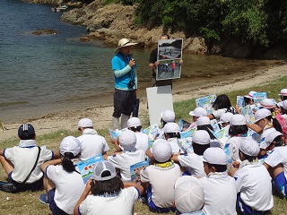 ここは、浜田マリン大橋の近くにある「おおうらの浜」です。まず、栽培漁業、中間育成に関する話を聞きました。 |