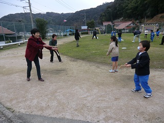 1・2年生は、生活科の時間に昔からの伝承遊びを体験しました。この日は、スクールバスで宇野公民館まで移動して、宇野町の高齢者クラブである「松寿会」の皆さんと一緒に、「こままわし」や「あやとり」などの昔遊びを通して交流しました。