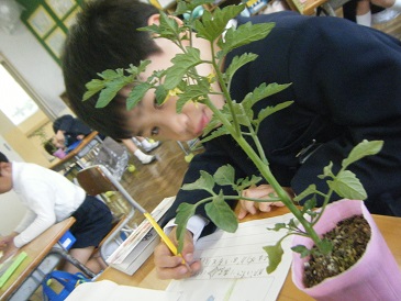 まずは教室でミニトマトの苗を見ながらスケッチです。