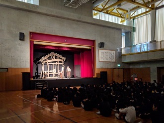 12月3日(火)、全校で三隅小学校に行き、劇団「あしぶえ」さんの公演、