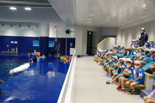 シロイルカのショーを見た後、バックヤードでシロイルカについて学びました。鳴き声など体験できました。