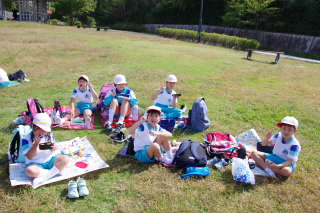 館内の展示を見て回ったり、なかよしタイムでアザラシの訓練の様子を見学したりした後は待ちに待ったお弁当です。さわやかな秋晴れの下、アクアスランドでお弁当を食べました。
