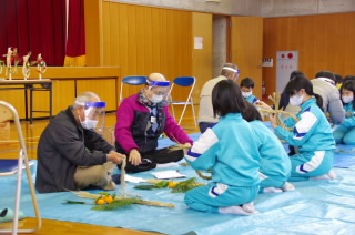 地域の方々には、事前にわらやうらじろなどの材料を準備していただいたり、入念に打ち合わせをしていただいたりしました。この日は丁寧に教えていただいたおかげでみんなが立派なしめ縄を作ることができました。日本の伝統にも触れることができました。