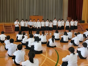 6月10日(月)、浜田ブロック大会、西部柔道大会の報告会を行いました。大会に参加した陸上部、ソフトテニス部、バスケットボール部、柔道部がそれぞれ大会の様子や、結果を報告しました。各部ともそれぞれの目標をもって大会にのぞみ、全力でプレーをしました。この経験を今後の学校生活等に活かしていきたいと思います。保護者、地域、関係者の皆さん応援ありがとうございました。