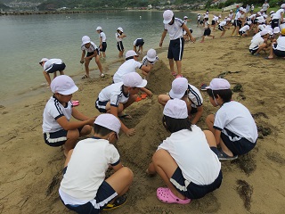 4年生は、総合的な学習の時間で、ふるさとの海をテーマにした取組を進めてきました。この日は、夏休みを目の前にして、3年生と一緒にふるさとの浜辺で楽しい時間を過ごしました。イベントの中ほどだけですが、その様子をお知らせします。