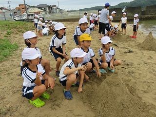 どの班も協力して大きな砂山を作って、トンネルを掘ったり、顔を作ったりして楽しんでいました。 |