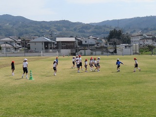 しばふの上で、仲間と一緒に体を動かしています。 |