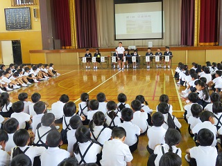 6年生が、学校のリーダーとなって活躍し始めて最初の児童総会が開かれました。今回は、各委員会の活動計画を発表して、各学級の代表が意見を述べたり、質問したりしました。